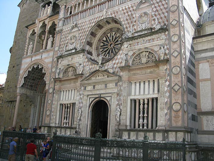En passant sous les arcades du palais, vous découvrez, collées l’une à l’autre, la Cappella Colleoni et la basilique Santa Maria Maggiore. La Capella a été conçue par Amadeo, l’architecte de ce chef-d’œuvre absolu qu’est la Chartreuse de Pavie. La façade dotée de marbres polychromes porte sa marque. L’intérieur est fastueux, avec ses stalles en marqueterie, ses fresques de Tiepolo, et le monument de Colleoni (le Condottiere Bartolomeo Colleoni) est l’œuvre d’Amadeo. Vous ressortez, et quelque deux mètres à votre droite vous admirez le porche du XIVème siècle de la Basilique Santa Maria Maggiore, ses piliers reposant sur des lions. A l’intérieur, vous découvrez de superbes tapisseries, qu’elles soient florentines ou flamande, pour celle qui se trouve au fond de la nef. Enfin, de magnifiques panneaux de marqueterie, dans la balustrade du chœur, vous décrivent l’Ancien Testament.