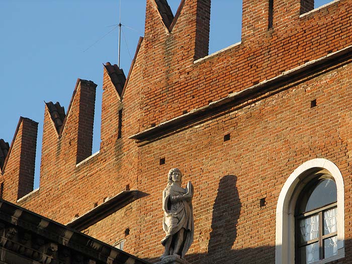 Non loin de là , nous avons été particulièrement séduits par la Piazza dei Signori. Le Palazzo della Ragione, le Palazzo dei Tribunali, et de l’autre côté la Loggia del Consiglio. Ne manquez pas la préfecture, au fond de la place, bâtiment officiel certes, mais du XIIIème siècle, et qu’on peut admirer sans problème sous l’œil placide d’un carabinier. En face ou presque de la préfecture, vous avez un chef-d’œuvre : le tombeau des Scaliger. Ce mausolée gothique, entouré d’une grille en fer forgée et d’une balustrade en marbre, accueille les membres de cette famille qui gouverna Vérone et lui donna toute sa splendeur. Cela vaut bien un instant de recueillement… Faites un « détour » (trois minutes !) pour vous rendre, via Capello, à la Casa di Giulietta, et le « balcon de Juliette » vous fera immanquablement sentir Roméo – ou Juliette, c’est selon.