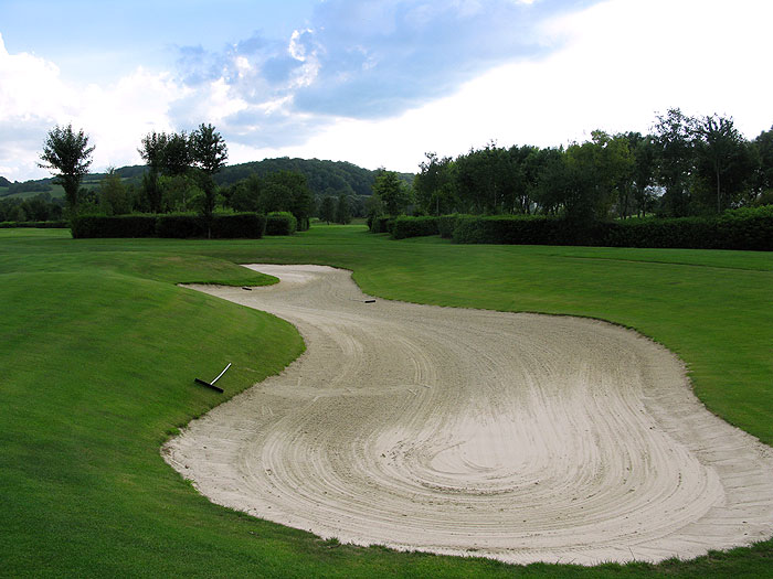Bien sûr, pour éviter que le parcours soit d’une monotonie absolue, les deux architectes Thierry Sprecher et Gerry Watine ont – bien- joué avec les obstacles d’eau dont le plus traître est le Rubillon, joli ruisseau très accueillant pour ladite petite balle blanche. Autrement, disons qu’il vaut mieux être un joueur assez long pour atteindre les pars en régulation (et votre serviteur, coauteur de ce blog – hcp 14 -, a quelque peu souffert) : 6036 mètres des blancs, 5783 des jaunes, 5149 des bleues et 4795 des rouges.