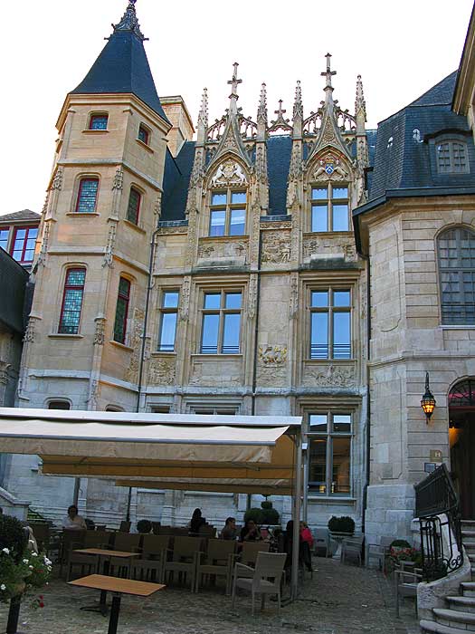 Galerie photos : l'Hôtel de Bourgtheroulde monument historique. On doit cette bâtisse de la première moitié du XVIe siècle, inspirée de l'art gothique et mâtinée d'influences Renaissance, à Guillaume le Roux, conseiller de l'Echiquier et seigneur de Bourgtheroulde. Le bâtiment du fond est de style gothique flamboyant. La galerie de gauche, de style Renaissance, présente six baies et de belles frises (les Triomphes de Pétrarque en partie haute et l'entrevue du Camp du Drap d'Or (1520) en partie basse).