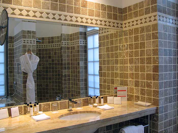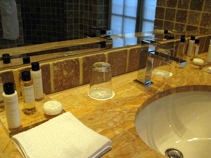 Bref, passons à la chambre. La nôtre donnait sur la cour intérieure, et c’était un ravissement. Quant au confort, il est cinq étoiles, ne nous y étendons pas, avec une mention particulière pour la vaste salle de bains sobre et élégante.