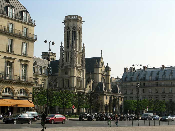 Galerie photo 2 : l'église. Sans guide et pour qui n'a pas suivi des cours d'histoire de l'art, il n'est pas évident de dater les différents éléments architecturaux et décoratifs de Saint-Germain l'Auxerrois tant cette église a subi de modifications au gré de l'Histoire et des courants artistiques. La première existence d'une église en ces lieux remonterait au Vème siècle. Une seconde église aurait été édifiée sous les Mérovingiens et détruite par les Vikings. De cela, aucune trace ne subsiste. Une troisième église est bâtie au Xème siècle, il n'en reste que les fondations de la tour romane élevée au XIIème siècle. Au XIIème siècle, c'est là que commence l'histoire de l'église actuelle, quand Philippe Auguste fait construire le Louvre (alors un château fort) et que la paroisse se révèle trop petite devant l'afflux de fidèles (nombre d'artisans s'établissant aux abords du chantier). Au XIIIème siècle, l'extension se poursuit avec l'ajout du porche extérieur, du chœur et de la chapelle de la Vierge. Au XVème siècle, nouvelles modifications dont la surélévation du porche… Au XVII ème siècle, les goûts ayant changé, on détruit des éléments médiévaux et Renaissance (le tympan sculpté du XIIIème siècle, le jubé dessiné par Pierre Lescot et sculpté par Jean Goujon, des vitraux de la nef remplacés par du verre blanc...). Après la mise à sac du monument par les anti-monarchistes en 1831, sa restauration se fait dans le style médiéval, les architectes et les artistes du XIXème (tel Viollet-Le-Duc) ayant un goût prononcé pour le Moyen-Âge…