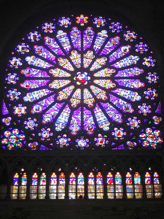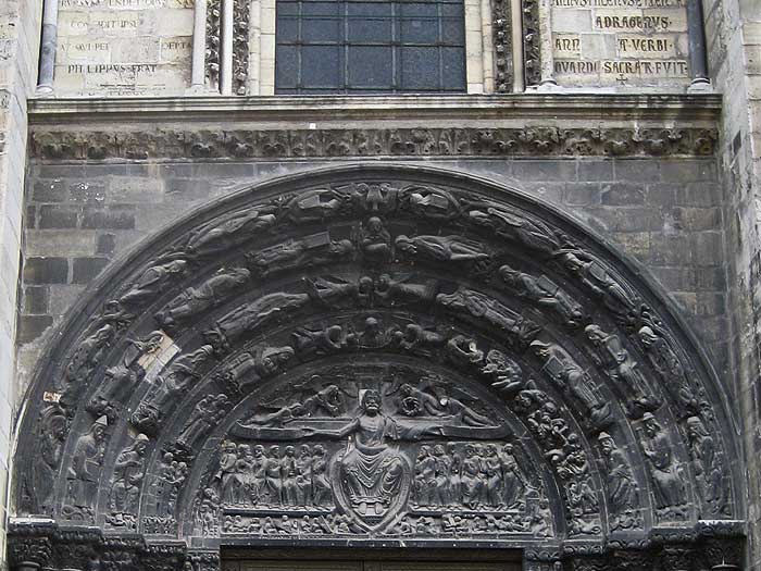 Ces rappels historiques faits, parlons de ce que nous voyons aujourd’hui. L’extérieur pâtit de l’absence de la tour gauche, mais reste fort beau, surtout si vous examinez le tympan du portail central, représentant le Jugement Dernier (thème classique des tympans) ; les tympans des portails latéraux représentent à gauche le martyre de Saint-Denis et de Rustique et Eleuthère, et à droite la dernière communion de Saint-Denis. A droite de la Basilique, là où se situe l’entrée, vous verrez les majestueux arcs-boutants.