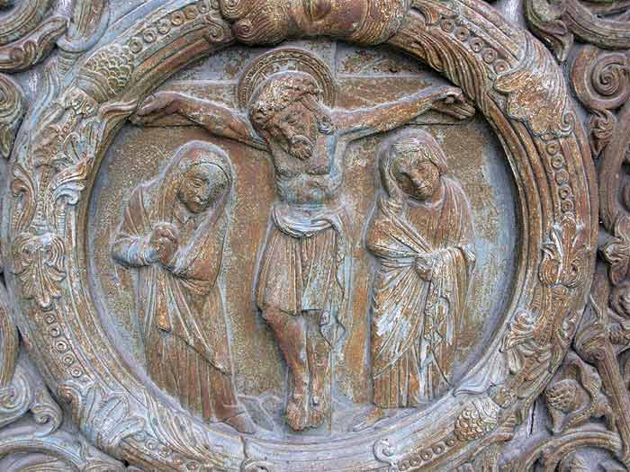 Détail de la façade occidentale : bas-reliefs surmontant le deuxième niveau d'arcades du côté droit.